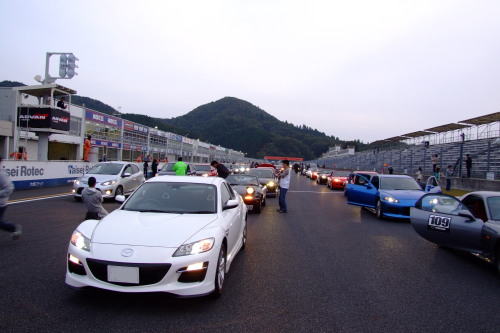 手伝いに来たものの、要領等は全くわからず、ぼやーーっと観戦。案外これが楽しい。当日は、大量のRX-8、続いておなじみのロードスターにRX-7、よく見るとランティス!もいたり、はたまたレビューが走ってたり!ノーマルに近いRX-8やその他の車両が静かなこと!チューンしたNAのロードスターとNCのロードスターで全くエンジンの音は違うし! ロータリーは、目の前を行き過ぎるとベベベベッって排気音。うんんーーーやっぱり、ロータリー系のこの音あんまし好きでない・・・何て内心の内心で思ったり(汗。