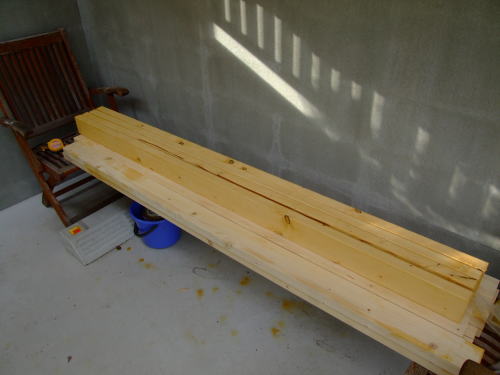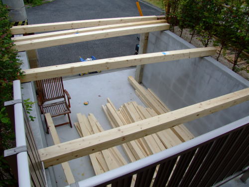 まずは、防腐をかねて塗装中。これまた、ネットでみるとキシラデコールという塗装を塗るようなのですが、妙に高いドイツ生まれなので・・・安い塗料を選んだ(苦笑。 しかも、設計図無しです。ホームセンターでお得そうなサイズを吟味して、どう組合すかその場でテキトーにイメージ、、、計算機で本数出して、軽トラで持ち帰りました。これでも血液型A型なのですが、我ながらA型を輸血されると倒れると思う。